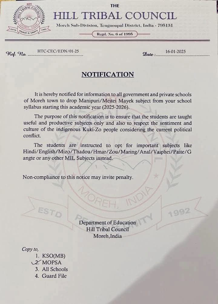 The Hill Tribal Council (HTC) has directed all schools in Moreh to remove the Manipuri/Meitei Mayek subject from their curriculum starting from this academic year 2025-26 in a notification dated Jan 16, 2025.